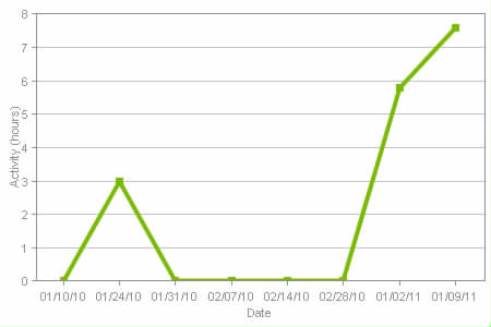 This chart shows activity for the week. As you can see it starts with last year and my weekly activity level was not very much. This year I have kept up my walking. Starting at the end of July 2010 I started walking everyday for roughly an hour a day. I usually go to the YMCA and walk on a treadmill. I do walk outside if I do not have access to a treadmill. I started at around 2.5 miles in an hour and 5 minutes. 5 minutes for cool down on the treadmill… The past few weeks I have been going 4.82 miles in an hour and 5 minutes walking at a 4.5 mph pace. I also have been doing Aqua Zumba about 3 days a week for an hour along with walking everyday. So I should get in around 10 hours and 35 minutes of activity each week.