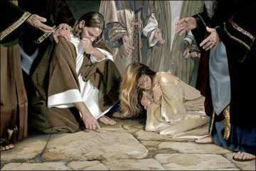 Then each of them went home, while Jesus went to the Mount of Olives. Early in the morning he came again to the temple. All the people came to him and he sat down and began to teach them. The scribes and the Pharisees brought a woman who had been caught in adultery; and making her stand before all of them, they said to him, ‘Teacher, this woman was caught in the very act of committing adultery. Now in the law Moses commanded us to stone such women. Now what do you say?’ They said this to test him, so that they might have some charge to bring against him. Jesus bent down and wrote with his finger on the ground. When they kept on questioning him, he straightened up and said to them, ‘Let anyone among you who is without sin be the first to throw a stone at her.’ And once again he bent down and wrote on the ground. When they heard it, they went away, one by one, beginning with the elders; and Jesus was left alone with the woman standing before him. Jesus straightened up and said to her, ‘Woman, where are they? Has no one condemned you?’ She said, ‘No one, sir.’ And Jesus said, ‘Neither do I condemn you. Go your way, and from now on do not sin again.’ (John 7:53—8:11, NRSV)