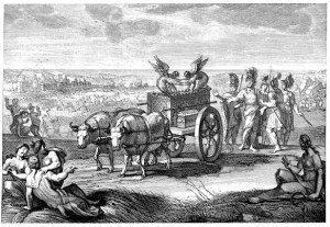 The ark of the Lord was in the country of the Philistines seven months.Then the Philistines called for the priests and the diviners and said, “What shall we do with the ark of the Lord? Tell us what we should send with it to its place.” They said, “If you send away the ark of the God of Israel, do not send it empty, but by all means return him a guilt offering. Then you will be healed and will be ransomed; will not his hand then turn from you?” And they said, “What is the guilt offering that we shall return to him?” They answered, “Five gold tumors and five gold mice, according to the number of the lords of the Philistines; for the same plague was upon all of you and upon your lords. So you must make images of your tumors and images of your mice that ravage the land, and give glory to the God of Israel; perhaps he will lighten his hand on you and your gods and your land. Why should you harden your hearts as the Egyptians and Pharaoh hardened their hearts? After he had made fools of them, did they not let the people go, and they departed? Now then, get ready a new cart and two milch cows that have never borne a yoke, and yoke the cows to the cart, but take their calves home, away from them. Take the ark of the Lord and place it on the cart, and put in a box at its side the figures of gold, which you are returning to him as a guilt offering. Then send it off, and let it go its way. And watch; if it goes up on the way to its own land, to Beth-shemesh, then it is he who has done us this great harm; but if not, then we shall know that it is not his hand that struck us; it happened to us by chance.” The men did so; they took two milch cows and yoked them to the cart, and shut up their calves at home. They put the ark of the Lord on the cart, and the box with the gold mice and the images of their tumors. The cows went straight in the direction of Beth-shemesh along one highway, lowing as they went; they turned neither to the right nor to the left, and the lords of the Philistines went after them as far as the border of Beth-shemesh. Now the people of Beth-shemesh were reaping their wheat harvest in the valley. When they looked up and saw the ark, they went with rejoicing to meet it. The cart came into the field of Joshua of Beth-shemesh, and stopped there. A large stone was there; so they split up the wood of the cart and offered the cows as a burnt offering to the Lord.The Levites took down the ark of the Lord and the box that was beside it, in which were the gold objects, and set them upon the large stone. Then the people of Beth-shemesh offered burnt offerings and presented sacrifices on that day to the Lord. When the five lords of the Philistines saw it, they returned that day to Ekron. (1 Samuel 6:1-16, NRSV)
