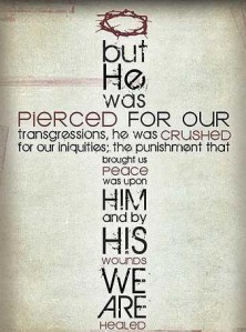 For he grew up before him like a young plant, and like a root out of dry ground; he had no form or majesty that we should look at him, nothing in his appearance that we should desire him. He was despised and rejected by others; a man of suffering and acquainted with infirmity; and as one from whom others hide their faces he was despised, and we held him of no account. Surely he has borne our infirmities and carried our diseases; yet we accounted him stricken, struck down by God, and afflicted. But he was wounded for our transgressions, crushed for our iniquities; upon him was the punishment that made us whole, and by his bruises we are healed. All we like sheep have gone astray; we have all turned to our own way, and the Lord has laid on him the iniquity of us all. He was oppressed, and he was afflicted, yet he did not open his mouth; like a lamb that is led to the slaughter, and like a sheep that before its shearers is silent, so he did not open his mouth. By a perversion of justice he was taken away. Who could have imagined his future? For he was cut off from the land of the living, stricken for the transgression of my people. They made his grave with the wicked and his tomb with the rich, although he had done no violence, and there was no deceit in his mouth. Yet it was the will of the Lord to crush him with pain. When you make his life an offering for sin, he shall see his offspring, and shall prolong his days; through him the will of the Lord shall prosper. Out of his anguish he shall see light; he shall find satisfaction through his knowledge. The righteous one, my servant, shall make many righteous, and he shall bear their iniquities. Therefore I will allot him a portion with the great, and he shall divide the spoil with the strong; because he poured out himself to death, and was numbered with the transgressors; yet he bore the sin of many, and made intercession for the transgressors. (Isaiah 53:2-12, NRSV)