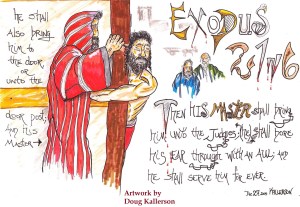 Then the master takes him to the post and drives an awl through his ear and gives him a ring and he becomes the master’s slave for life. The male slave likes his place there so the master puts a ring on it!