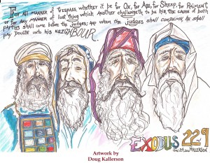 When someone steals an ox or a sheep, and slaughters it or sells it, the thief shall pay five oxen for an ox, and four sheep for a sheep. The thief shall make restitution, but if unable to do so, shall be sold for the theft. When the animal, whether ox or donkey or sheep, is found alive in the thief’s possession, the thief shall pay double. If a thief is found breaking in, and is beaten to death, no bloodguilt is incurred; but if it happens after sunrise, bloodguilt is incurred. When someone causes a field or vineyard to be grazed over, or lets livestock loose to graze in someone else’s field, restitution shall be made from the best in the owner’s field or vineyard. When fire breaks out and catches in thorns so that the stacked grain or the standing grain or the field is consumed, the one who started the fire shall make full restitution. When someone delivers to a neighbor money or goods for safekeeping, and they are stolen from the neighbor’s house, then the thief, if caught, shall pay double. If the thief is not caught, the owner of the house shall be brought before God, to determine whether or not the owner had laid hands on the neighbor’s goods. In any case of disputed ownership involving ox, donkey, sheep, clothing, or any other loss, of which one party says, “This is mine,” the case of both parties shall come before God; the one whom God condemns shall pay double to the other. When someone delivers to another a donkey, ox, sheep, or any other animal for safekeeping, and it dies or is injured or is carried off, without anyone seeing it, an oath before the Lord shall decide between the two of them that the one has not laid hands on the property of the other; the owner shall accept the oath, and no restitution shall be made. But if it was stolen, restitution shall be made to its owner. If it was mangled by beasts, let it be brought as evidence; restitution shall not be made for the mangled remains. When someone borrows an animal from another and it is injured or dies, the owner not being present, full restitution shall be made. If the owner was present, there shall be no restitution; if it was hired, only the hiring fee is due. (Exodus 22:1-15, NRSV)