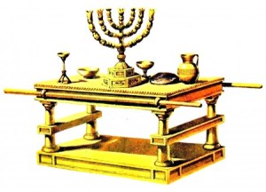 You shall make a table of acacia wood, two cubits long, one cubit wide, and a cubit and a half high. You shall overlay it with pure gold, and make a molding of gold around it. You shall make around it a rim a handbreadth wide, and a molding of gold around the rim. You shall make for it four rings of gold, and fasten the rings to the four corners at its four legs. The rings that hold the poles used for carrying the table shall be close to the rim. You shall make the poles of acacia wood, and overlay them with gold, and the table shall be carried with these. You shall make its plates and dishes for incense, and its flagons and bowls with which to pour drink offerings; you shall make them of pure gold. And you shall set the bread of the Presence on the table before me always. You shall make a lampstand of pure gold. The base and the shaft of the lampstand shall be made of hammered work; its cups, its calyxes, and its petals shall be of one piece with it; and there shall be six branches going out of its sides, three branches of the lampstand out of one side of it and three branches of the lampstand out of the other side of it; three cups shaped like almond blossoms, each with calyx and petals, on one branch, and three cups shaped like almond blossoms, each with calyx and petals, on the other branch—so for the six branches going out of the lampstand. On the lampstand itself there shall be four cups shaped like almond blossoms, each with its calyxes and petals. There shall be a calyx of one piece with it under the first pair of branches, a calyx of one piece with it under the next pair of branches, and a calyx of one piece with it under the last pair of branches—so for the six branches that go out of the lampstand. Their calyxes and their branches shall be of one piece with it, the whole of it one hammered piece of pure gold. You shall make the seven lamps for it; and the lamps shall be set up so as to give light on the space in front of it. Its snuffers and trays shall be of pure gold. It, and all these utensils, shall be made from a talent of pure gold. And see that you make them according to the pattern for them, which is being shown you on the mountain. (Exodus 25:23-40, NRSV)