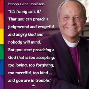 This could go along with a picture I’ve seen recently of Bishop Gene Robinso. He talked about how it’s funny we can preach a vengeful God and no one bats an eye but we start saying God is loving and welcoming and we get upset. Because we don’t want that person in and if God is truly all accepting then they will be in and that just can’t be.