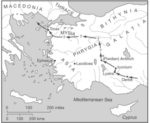 Paul went on also to Derbe and to Lystra, where there was a disciple named Timothy, the son of a Jewish woman who was a believer; but his father was a Greek. 2He was well spoken of by the believers in Lystra and Iconium. 3Paul wanted Timothy to accompany him; and he took him and had him circumcised because of the Jews who were in those places, for they all knew that his father was a Greek. 4As they went from town to town, they delivered to them for observance the decisions that had been reached by the apostles and elders who were in Jerusalem. 5So the churches were strengthened in the faith and increased in numbers daily. 6 They went through the region of Phrygia and Galatia, having been forbidden by the Holy Spirit to speak the word in Asia. 7When they had come opposite Mysia, they attempted to go into Bithynia, but the Spirit of Jesus did not allow them; 8so, passing by Mysia, they went down to Troas. 9During the night Paul had a vision: there stood a man of Macedonia pleading with him and saying, ‘Come over to Macedonia and help us.’ 10When he had seen the vision, we immediately tried to cross over to Macedonia, being convinced that God had called us to proclaim the good news to them. (Acts 16:1-10, NRSV)