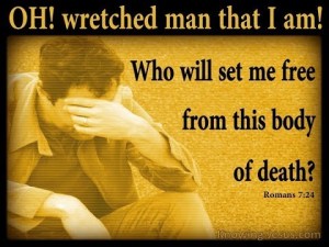 21So I find it to be a law that when I want to do what is good, evil lies close at hand. 22For I delight in the law of God in my inmost self, 23but I see in my members another law at war with the law of my mind, making me captive to the law of sin that dwells in my members. 24Wretched man that I am! Who will rescue me from this body of death? 25Thanks be to God through Jesus Christ our Lord! So then, with my mind I am a slave to the law of God, but with my flesh I am a slave to the law of sin. (Romans 7:21-25, NRSV)