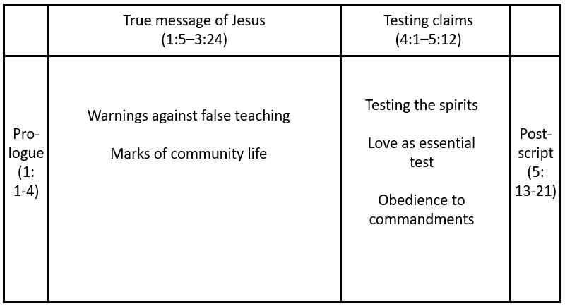 Warnings against false teaching Do not love the world or things of the world but do the will of the father (2:15-17). Beware the antichrist who has gone out from our community and denies that Jesus is the Christ (2:18-25). You are anointed by God and that anointing helps you know what is true and what is a lie, so abide in Him (2:26-27). Marks of community life Love one another and not be like those who hate (3:11-12). If you have the means help a brother or sister (3:17). Let us love in action not just speech so everyone will know we are from the truth (3:18-19). All who obey God’s commandments abide in God and God in them (3:23-24). Testing the spirits DO not simply believe someone but test their words for many false prophets are in the world, every spirit that confesses Jesus is of God and all others are not (4:1-3). Those in the community are of God and those who aren’t are of the world, those in the community listen to God (4:4-6). Love as essential test Love one another to show we are part of God because love is from God and whoever does not love doesn’t know God (4:7-8). We love because God loved us (4:9-12). Whoever says I love God yet hates their brother is a liar and does not abide in love (4:20). Obedience to commandments We love God’s children when we obey the commandments, for this is love of God. (5:2-3). When we are born of God we conquer the world, and this is through believing Jesus is God’s Son (5:4-5)