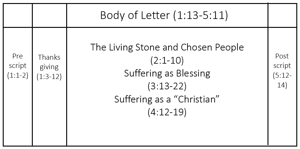 Living Stone and Chosen People Jesus was rejected by mortals and yet is the living corner stone of our life (2:4). All believers are spiritual stones that God is making a spiritual home. (2:5-6). As living stones we are God’s chosen people, a royal nation, a people to show light to the world (2:9-10). Suffering as Blessing Do good even if it leads to suffering for in this you are blessed (3:13-14). Be ready to say why you do good, with gentleness and reverence so that your abusers will be shamed (3:15-16). For Christ suffered once and for all for all sin and was put to death and raised to life (3:18). Jesus went to the “spirits in prison” (3:19) who didn’t listen to God’s warning during the flood, which prefigures baptism, which now saves you. (3:20-22). Suffering as a “Christian” Do not be surprised when you undergo trials, but rejoice in suffering as Christ suffered (4:12-13). You are blessed for being reviled because of Jesus (4:14). Do not be disgraced for suffering as Jesus for in this God will bless you, continue to do good (4:15-19). Postscript Peter’s faithful brother Silvanus brought the letter to commend the true grace of God. The church in Rome sends its greetings. (5:12-14)