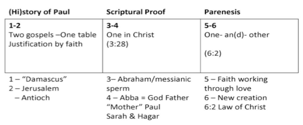 An “Other/Non-Gospel” Paul can’t understand why the Galatians have listened to someone giving them a message contrary to the one he gave them. Anyone proclaiming another gospel is ἀνάθεμα (Gal1:8-9). “Damascus” Paul assures the Galatians he did not give them a second hand gospel or a story that was given to him by other apostles. He received the gospel he shares from Jesus Christ (Gal 1:12). Paul reminds them he persecuted the church (Gal 1:13-14) but when God met him and set him apart he didn’t confer with other humans he took what God gave him and proclaimed it (Gal1:15-17). The Jerusalem Conference After 14 years Paul, with Titus and Barnabas, went to Jerusalem and met with the acknowledged leaders in private and laid before them the gospel Paul had been preaching (Gal 2:1-2). That circumcision was not needed to be a follower and Paul and Peter could take the gospel to different groups, Paul the uncircumcised and Peter the circumcised (Gal 2:9). Antioch Paul rebuked Peter for eating with Gentiles and then deciding not to in fear of the circumcision faction (Gal 2:11-12). Peter shouldn’t ask the Gentiles to live like Jews when he lives like a Gentile and is a Jew (Gal 2:14). Justification We are all justified by grace in Christ and not by works (Gal 2:16). We are not justified by the law but by faith in Christ “and it is no longer I that live but Christ lives in me” (Gal 2:20). Retelling of a Genesis Patriarch Abraham “believed in God and it was reckoned to him as righteousness” (Gal 3:6) so we are descendants of Abraham. And if we rely on works through the law we are cursed. But Jesus redeemed us from the curse of the law by hanging on a tree and becoming a curse for us. (Gal 3:11-13). So the gospel can be given to all (Gal 3:14). One in Christ Now that followers of the way have faith we are freed to be one with Christ and children of God (Gal 3:25-26). For there are no separations and all are equal and one under Christ (Gal 3:28). “Abba” as Father God We were all enslaved to the world but when the time came, God sent Jesus to be born under the law to free us all from the law so we can cry Abba Father and be heirs with Jesus to the kingdom (Gal 4:1-7). Mother Paul Paul is perplexed at how the Galatians cared for him in his infirmity and yet have turned away from the gospel he gave them. Paul is in pain of helping the Galatians be the people Christ is calling them to be (Gal 4:12-20). Retelling of a Genesis Matriarch Do you want to be subject to the law, listen to the law, Abraham had two sons, one of a slave woman born of flesh and one of a free woman born of promise (Gal 4:21-23). And the one born of flesh is held to the law while the one born of promise is an heir. We are children of the promise and not under the law (Gal 4:28-31). Redefinition of Freedom We are free but need to use that freedom not for self-indulgence but in service to the other (Gal 5:13-15). Works of the Flesh and of the Spirit Works of the flesh are for our own satisfaction while works of the Spirit help others (Gal 5:16-18). Stay away from self-gratification for that leads to not getting the kingdom (Gal 5:19-21). And by contrast the Spirit produces love (Gal 5:22-25). Law of Christ We should restore our siblings in Christ and bear one another’s burdens (Gal 6:1-2). Sow in the spirit and do not look to the flesh (Gal 6:3-10). New Creation Circumcision or non-circumcision mean nothing without a changed life. Flesh doesn’t obtain the covenant, a changed life does (Gal 6:11-18).