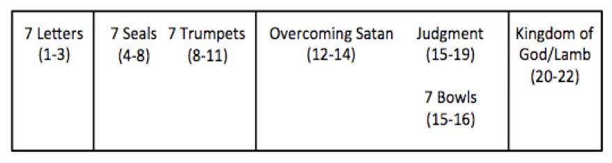 Prologue John, on the island of Patmos, on the Lord’s Day had a vision for seven churches (1:9-11). He saw seven lampstands and one like the Son of Man in a white robe with a golden sash, with white hair and eyes of flame (1:12-16). The man told John to not be afraid and to write the vision to the churches (1:17-20). 7 Letters To Ephesus you have endured patiently but you have forgotten your first love (2:1-4). Repent from where you have strayed (2:5). To Smyrna you are rich but afflicted and poor (2:8-9). Do not fear what is coming, beware testing and stay faithful (2:10-11). To Pergamum in the midst of a bad place you are holding onto God and not denying faith (2:12-13). But some of you are following false teachings (2:14-15), repent (2:16). To Thyatira I know your love, faith, service and patient endurance and how your last act is greater than your first (2:18-19). But you allow Jezebel to be called a prophet and to teach, she was given time to repent and now you need to repent, or I will give you what you deserve (2:20-23). But the rest who do not follow her, hold fast to what you have until I come (2:24-29). To Sardis you appear alive but are dead, wake up and do what you should before God (3:1-2). Remember what you received from God and do it, yet a few of you are going to be with me (3:3-5). To Philadelphia you have little power but have remained faithful to my word and not denied God (3:7-8). You will be kept from the hour of trial because you kept my word, hold fast to what you have for I am coming soon (3:10-11). To Laodicea you are neither hot nor cold but lukewarm so I am spitting you out (3:14-16). You think you have what you need but you don’t, so get what you need from me and follow, be truthful and repent (3:17-19). I am knocking at the door for you to hear me (3:20). Heavenly Throne Vision I was called to the vision by a voice like a trumpet, and at once in the spirit I saw a throne with one seated on it (4:1-2). Around the throne were 24 elders in white with gold crowns and seven flaming torches and on each side of the throne are four living creatures full of eyes all over, a lion, an ox, a human and an eagle each with 6 wings (4:3-8). All constantly worship the one on the throne (4:9-10). Four Apocalyptic Horse Riders The first seal opened a white horse appeared whose rider had a crown and a bow (6:1-2). The second seal opened brought another horse which was red whose rider took peace from the earth and yielded a sword (6:3-4). The third seal opened brought another horse which was black whose rider held scales to measure (6:5-6). The fourth seal opened brought another horse which was pale green whose rider was Death and Hades followed with him and they were given power over ¼ of the earth to kill with sword, famine and pestilence (6:7-8). 7 Trumpets The first trumpet brought hail and fire and 1/3 of the earth burned (8:7). The second trumpet brought a burning mountain of fire thrown into the sea that made 1/3 of the sea blood (8:8-9). The third trumpet caused a great star to fall from heaven and 1/3 of the water became wormwood (8:10-11). The fourth trumpet caused a third of the sun, moon and stars to be darkened (8:12). The fifth trumpet allowed access to the key to the bottomless pit and it was opened allowing locusts to ravage the earth except those sealed by God (9:1-6). The sixth trumpet allowed the release of the four angels bound to the Euphrates to kill a third of humankind (9:13-15). The seventh trumpet made the kingdom of the world the kingdom of God and the 24 elders fell and worshipped God (11:15-16). Heavenly woman A woman clothed with sun and moon was giving birth, in agony, before a dragon who was going to devour her child (12:1-4). She gave birth to a son who will rule the nations and was snatched away to God while the woman was sent to the wilderness for 1260 days (12:5-6). The Dragon, the Beasts and the Mark of the Beast Michael and his angels fought the dragon and threw it to earth (12:7-12). A beast rose from the see that looked like a leopard with seven heads and ten horns and it worshiped the dragon because the dragon gave the beast power, and the beast was haughty and uttered blasphemy and the people of earth worshipped it (13:1-8). The second beast rose from the earth and had two horns like a lamb but spoke like a dragon and it makes all the earth worship the first beast (13:11-15). The second beast causes all to be marked on their hand or forehead with 666 the mark of the beast (13:16-18) The Lamb The Lamb was on Mount Zion with 144,000 who had his name and his father’s name written on their foreheads and they worshipped with the 24 elders singing a song only they could learn (14:1-3). 7 Bowls The first bowl brought pain (16:2), the second made the sea blood (16:3), the third made other waters blood (16:4), the fourth allowed the sun to scorch people with fire (16:8-9), the fifth plunged the beasts kingdom into darkness (16:10-11), the sixth dried up the Euphrates and released frogs and caused a battle (16:12-17), and the seventh poured into the air and a voice cried “It is done” (16:17). Armageddon The great city was split in three, lightning flashed and earthquakes rumbled and islands disappeared and mountains vanished and all the earth cursed God for the plagues (16:18-21). The Whore of Babylon A woman clothed in purple and scarlet sitting on a seven headed beast with the name “Babylon the great, mother of whores and earth’s abomination” (17:4-5). Millennium Those who had remined faithful to Jesus were judged and reigned with Christ for 1000 years. (20:4-6). New Heaven, New Earth, New Jerusalem The first heaven and earth were destroyed and a new heaven and a new earth descended from heaven and God came down to be with God’s people and fulfill the kingdom of God and through this all things were made new for the healing of the nations (21:1-8).
